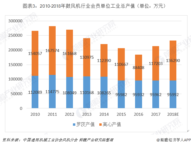 2017年,鼓风机行业协会会员单位离心鼓风机产值117203万元,比上年增长32.6%;罗茨鼓风机产值95962万元,比上年增长25.6%。据测算,2018年,协会会员单位鼓风产值合计达到232282万元,同比回升8.97%。