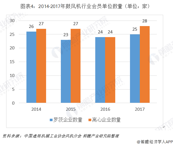 根据中国通用机械工业协会风机分会统计,截至2017年底,协会会员单位生产离心鼓风机的企业有28家,比上年增加4家;生产罗茨鼓风机的企业有25家。