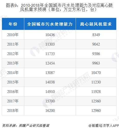 根据历年数据和规划进行测算,2018年城市污水处理厂数量会略有提升,达到2300个左右,污水厂日处理能力达到1.62亿立方米/日,按照日处理能力50000吨配比4台高压离心鼓风机的比例,2018年我国城市污水处理所需高压离心鼓风机数量为12960台。